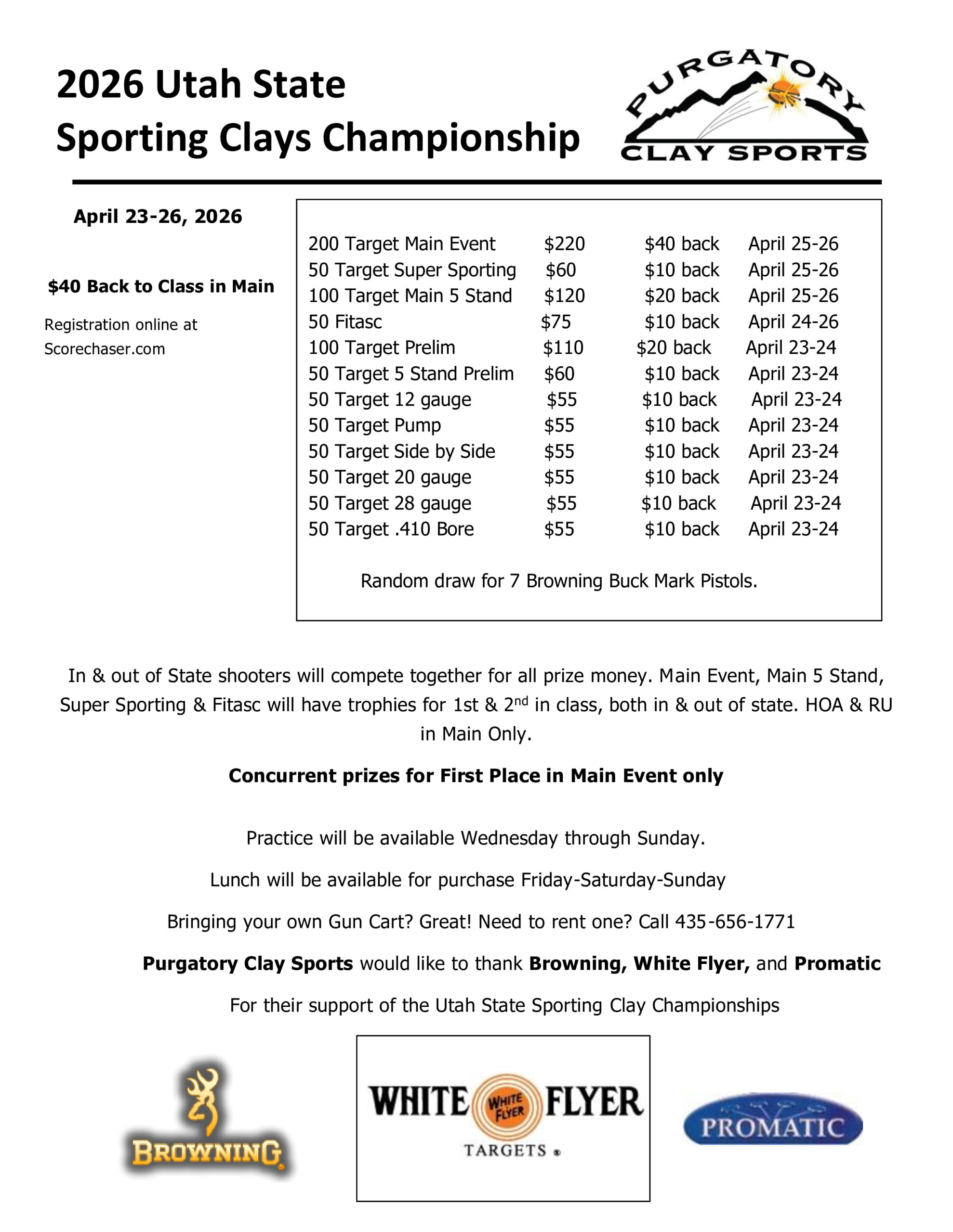 April 18th all sporting clays closed except the Flats course, only Trap and skeet will be open on april 19th. Utah State Sporting Clays Championship, April 23,24,25,26th. all venues will be closed April 22nd-26th for the utah state championship.